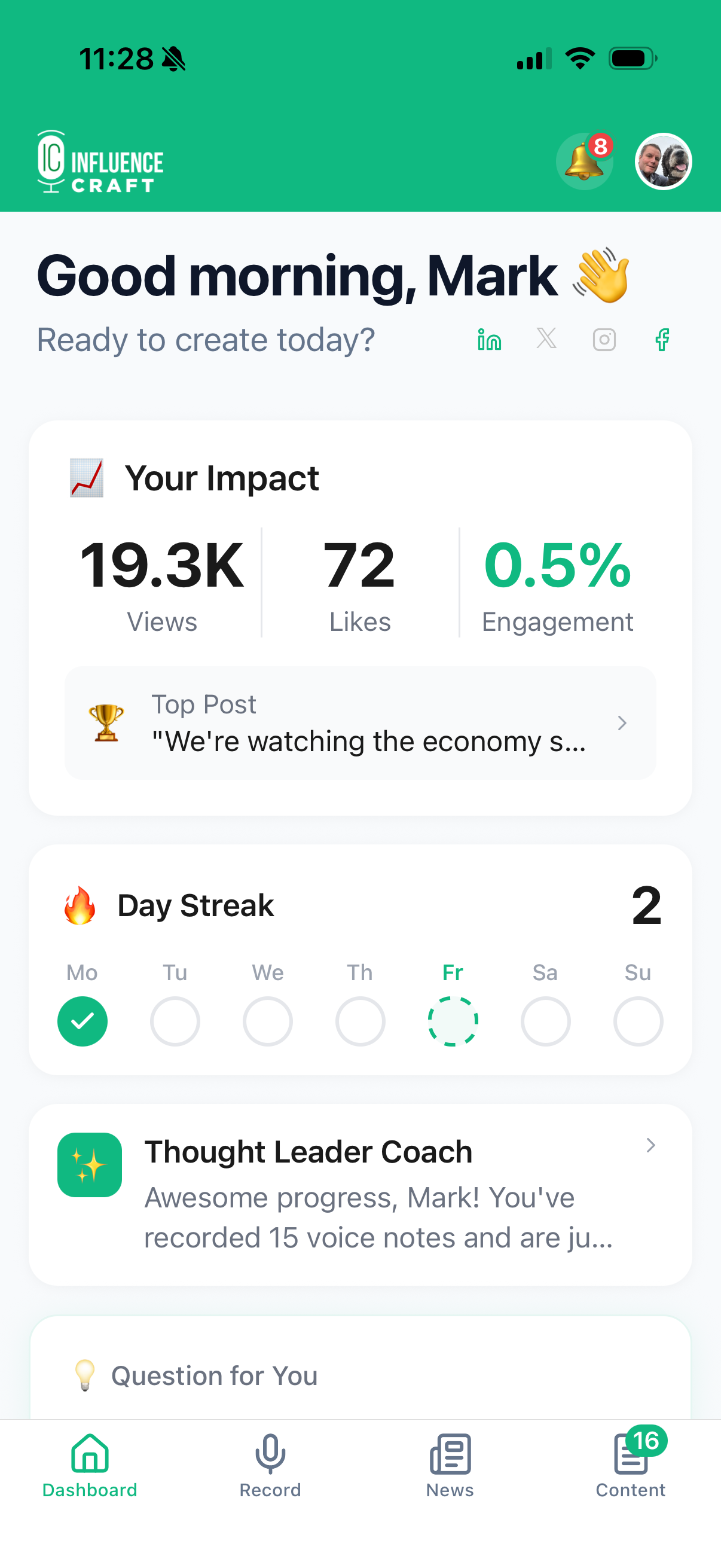 Consistent publishing isn't just about volume—it's about strategy. Your Coach helps you identify what's worth sharing, suggests angles that showcase your expertise, and ensures your content calendar stays full across all platforms.